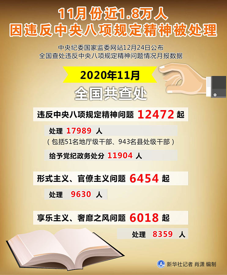 新華社北京12月24日電(記者孫少龍)中央紀委國家監委網站24日公布全國查處違反中央八項規定精神問題情況月報數據。通報顯示,2020年11月,全國共查處違反中央八項規定精神問題12472起,處理17989人(包括51名地廳級干部、943名縣處級干部),給予黨紀政務處分11904人。