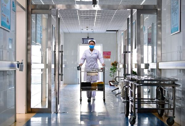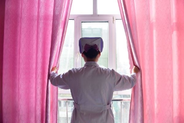 12月16日,海東市第一人民醫院內科護士劉海婷在病房內為患者拉開窗簾。