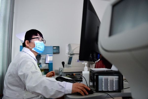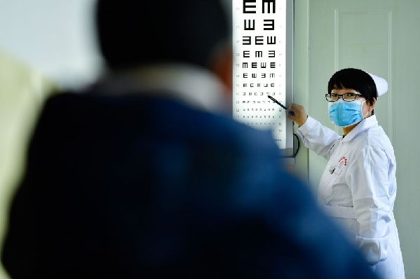 12月16日,海東市第二人民醫院眼科護士許國娟在給患者檢查視力。