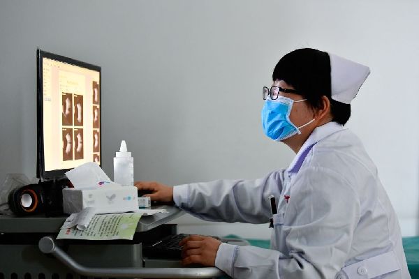 12月16日,海東市第二人民醫院眼科護士許國娟在給患者檢查眼睛。