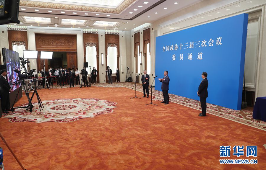 全國(guó)政協(xié)十三屆三次會(huì)議首場(chǎng)“委員通道”采訪活動(dòng)于5月21日在人民大會(huì)堂新聞發(fā)布廳舉行,邀請(qǐng)部分全國(guó)政協(xié)委員通過(guò)網(wǎng)絡(luò)視頻方式接受媒體采訪。圖為“委員通道”現(xiàn)場(chǎng)。新華網(wǎng) 王翰林 攝