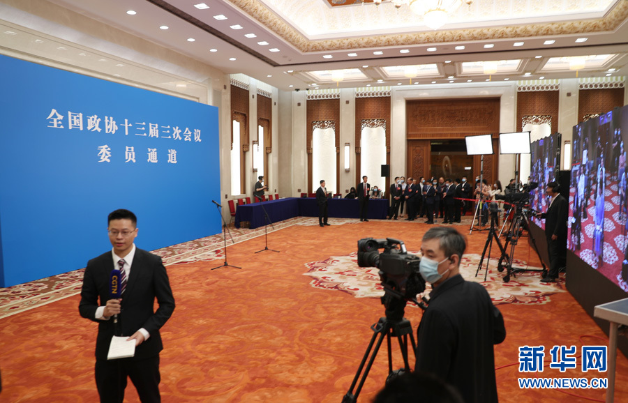 ??? 全國政協十三屆三次會議首場“委員通道”采訪活動于5月21日在人民大會堂新聞發布廳舉行,邀請部分全國政協委員通過網絡視頻方式接受媒體采訪。圖為