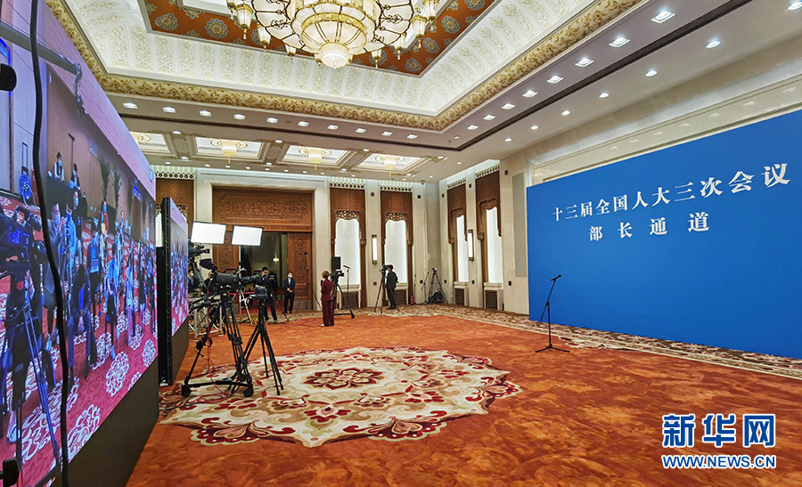 5月22日,十三屆全國人大三次會議開幕會結束后,首場“部長通道”采訪活動在人民大會堂新聞發布廳舉行,邀請部分列席會議的國務院有關部委負責人通過網絡視頻方式接受采訪。圖為“部長通道”現場。新華網 王翰林 攝