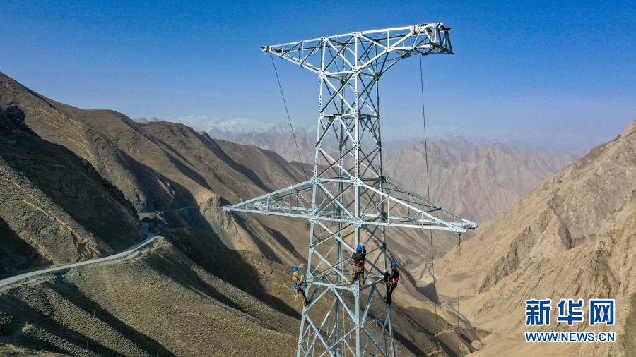 2020年4月28日,在新疆葉城縣南部山區(qū)海拔3100多米的阿卡孜達(dá)坂上,工人登上鐵塔檢修零部件,為放線做準(zhǔn)備(無(wú)人機(jī)照片)。