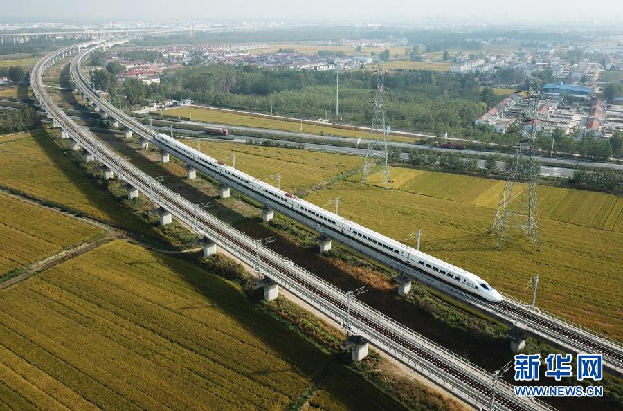 2020年10月10日,一列動車組列車行駛在江蘇連云港市境內(無人機照片)。
