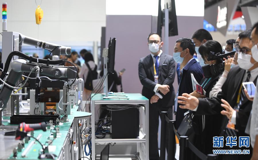 2020年11月6日,在進博會技術裝備展區,人們在西門子展臺觀看人機協作的智能化單元生產線。新華社記者 李任滋 攝