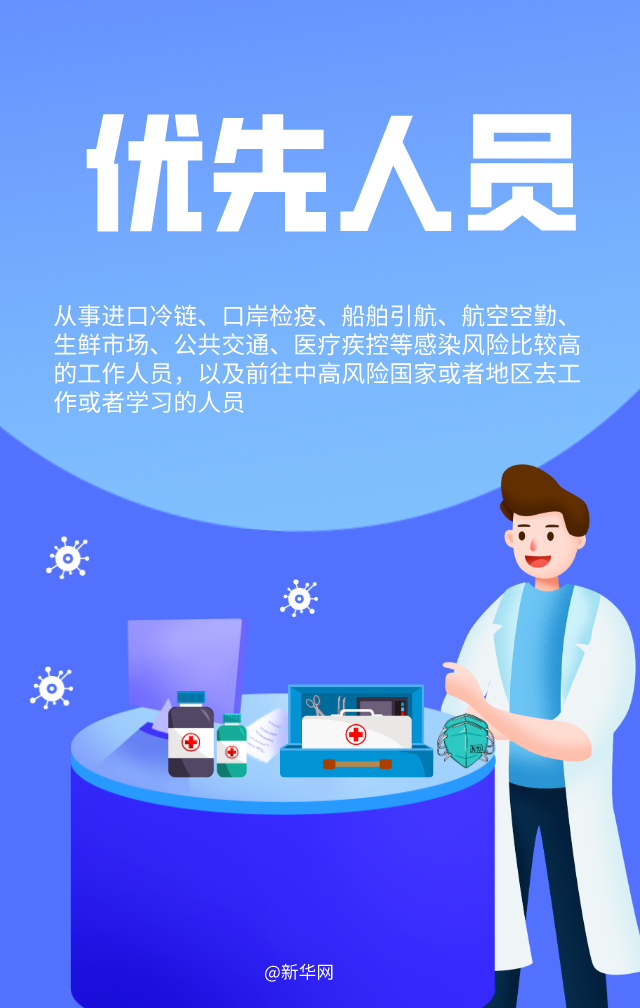 1月1日起,部分地區重點人群開始接種我國首批新冠病毒疫苗。哪些人員優先接種?接種疫苗需要打幾針?哪些人不適合接種?接種疫苗后是否需要繼續戴口罩?十個關鍵詞帶你了解新冠病毒疫苗接種要點。