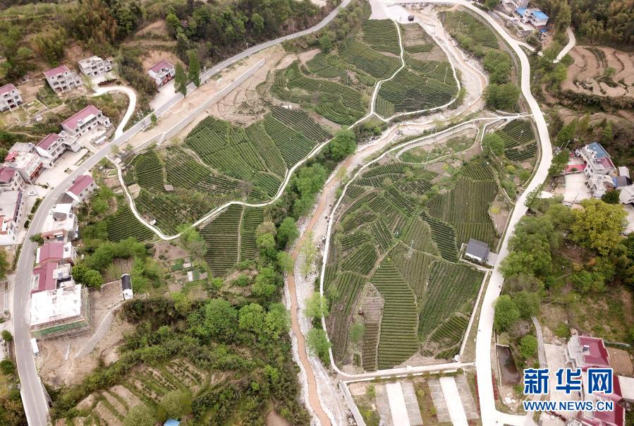 這是2020年4月17日拍攝的金寨縣花石鄉大灣村的茶產業扶貧基地(無人機照片)。新華社記者劉軍喜攝