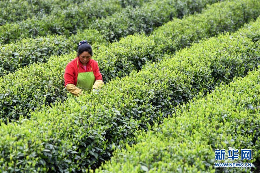 金寨縣花石鄉大灣村村民在茶產業扶貧基地里采茶(2020年4月17日攝)。新華社記者劉軍喜攝