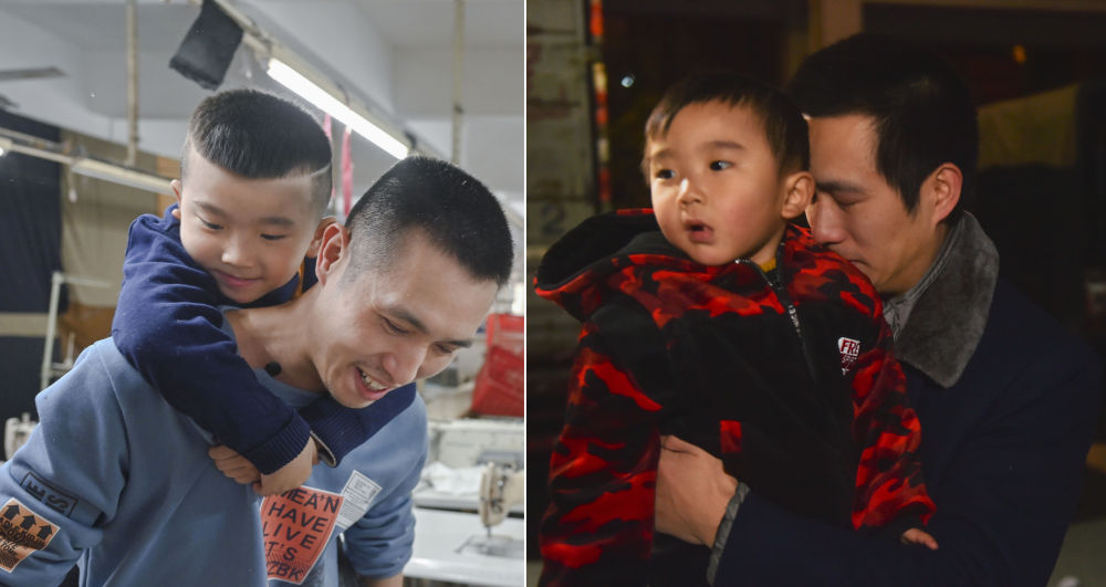 左圖為2021年1月26日,在福建省石獅市的金利萊斯服裝廠,聰聰和黃海龍在一起;右圖為2018年2月2日凌晨,黃海龍即將登上返回四川的長途車,在上車前抱著不滿3歲的聰聰難舍難分。