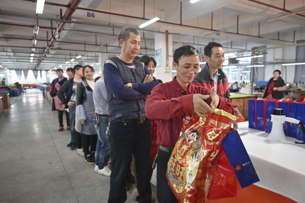在工廠工作了十多年的張良國將領到的年貨拍成照片,發給遠在四川老家的兒子,告訴家人這里一切都好。