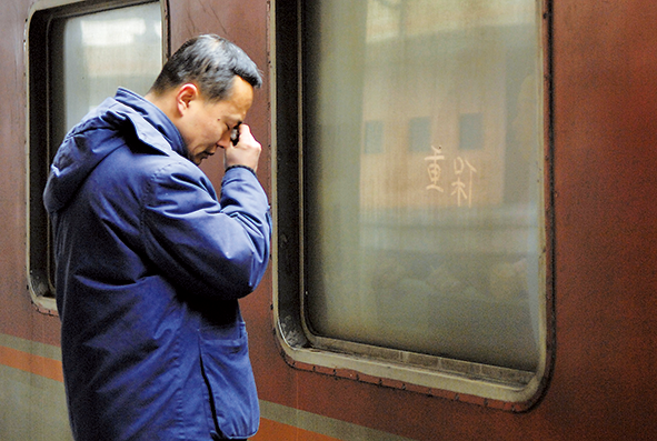 這時乘客們已經基本都上車,站臺上留下不多的送站旅客。車窗里兩位老人,一位正在擦拭眼睛,另一位在小本子上寫字,再透過窗戶拿給車外的中年男子看。兩位老人揮手讓站臺上的男子先走,他卻一直站著,不斷低頭拭淚。小小的車窗成為臨別溝通的橋梁,玻璃上的“保重”則是他們對彼此最深情的叮囑。