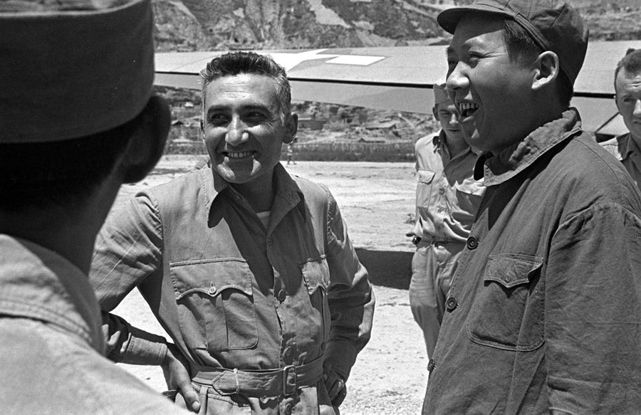 1944年,毛澤東同志和馬海德在延安。在抗日戰爭和解放戰爭期間,馬海德曾接待過許多到延安訪問的外國記者、外交官、軍人,包括1944年駐華美軍司令史迪威將軍派駐延安的美軍觀察組。 新華社圖片