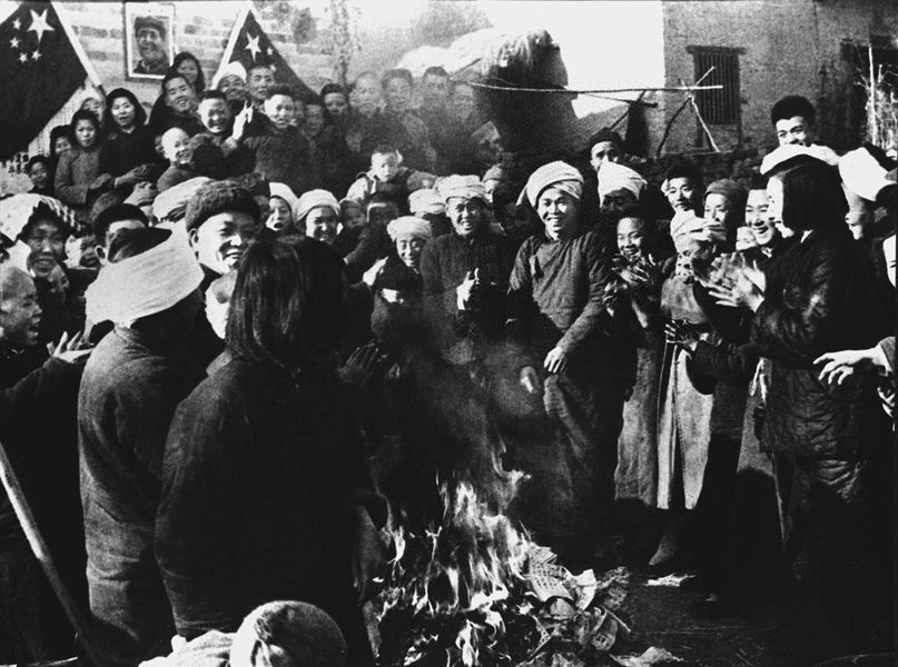 土地改革中湖南岳陽縣策口鄉農民燒毀舊地契。 新華社圖片