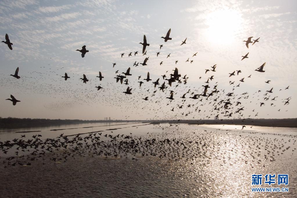 成群羅紋鴨在湖南西洞庭湖國家級自然保護區飛翔(2020年11月11日攝,無人機照片)。新華社記者 陳思汗 攝