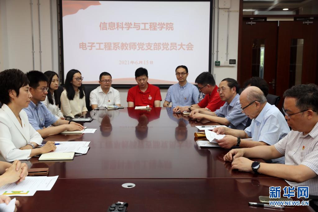 6月15日,在復旦大學信息科學與工程學院電子工程系教師黨支部黨員大會上,已成為中共預備黨員的陳振新(左)發言。新華社記者 劉穎 攝