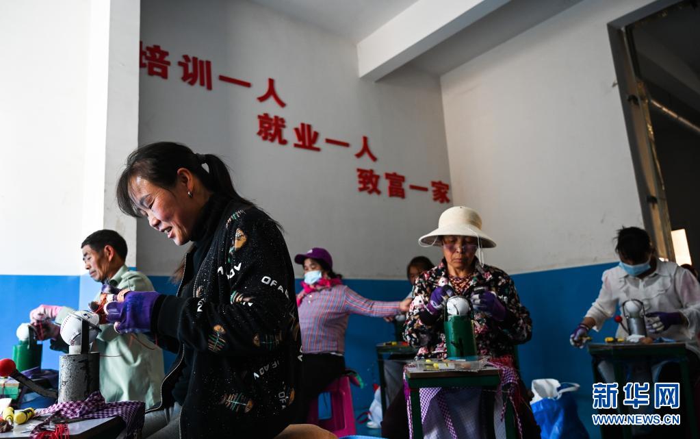 4月26日,搬遷群眾在云南會澤新城搬遷安置點棒球制作車間內工作。新華社記者 王冠森 攝