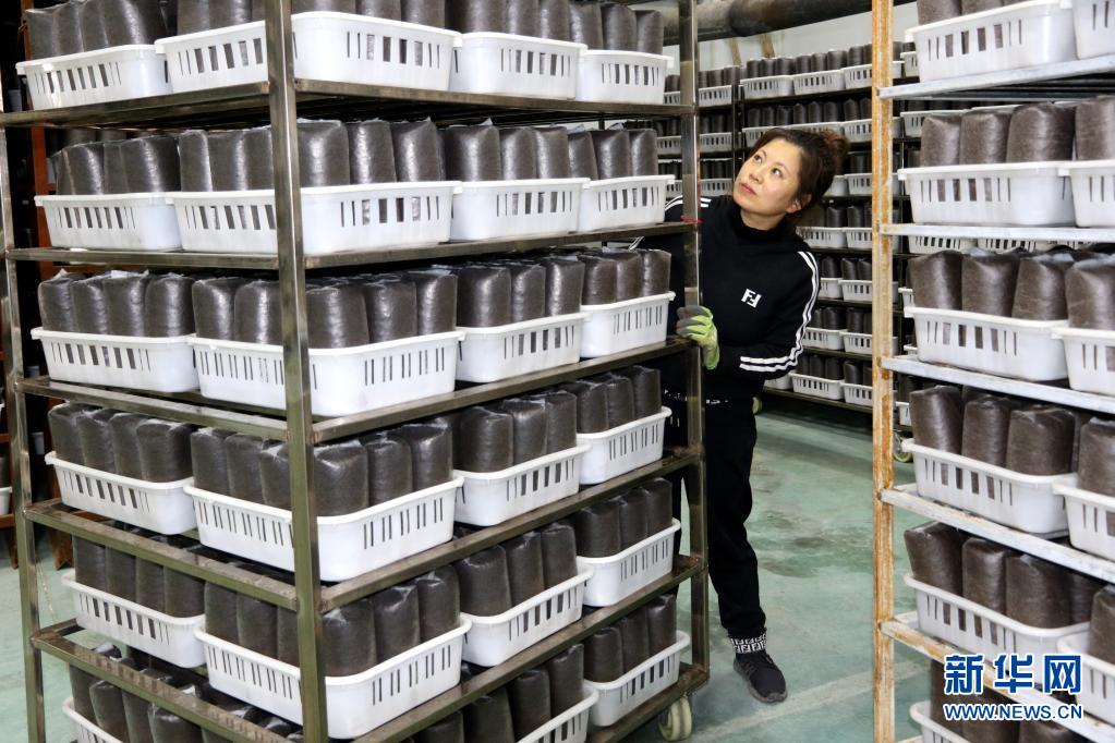 在黑龍江省寶清縣寶清鎮雙泉村的食用菌基地,食用菌種植專業合作社理事長鞠秀芹查看菌包(4月16日攝)。新華社發