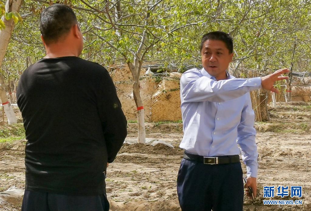 馮武年(右)在基層調研(2019年4月8日攝)。新華社發(皮山縣委宣傳部供圖)