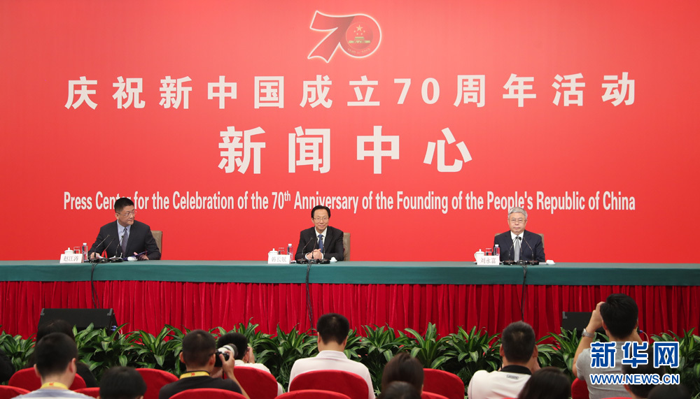 9月27日,慶祝中華人民共和國成立70周年活動新聞中心在梅地亞中心二層新聞發布廳舉辦第三場新聞發布會,中央農村工作領導小組辦公室主任、農業農村部部長韓長賦,國務院扶貧開發領導小組辦公室主任劉永富介紹全面建成小康社會,扎實推進脫貧攻堅和鄉村振興,并回答記者提問。圖為發布會現場。新華網 陳杰 攝