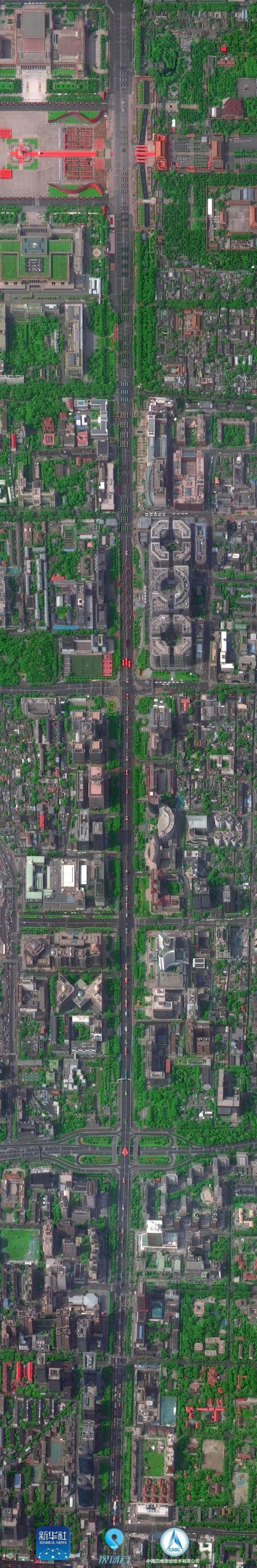 10月1日,“高景一號”拍攝的北京長安街全畫幅衛星閱兵圖