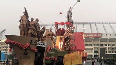 以“同心共筑中國夢”為主題的群眾游行開始。游行分“建國創(chuàng)業(yè)”“改革開放”“偉大復興”三個篇章,10萬群眾和70組彩車組成36個方陣和3個情境式行進