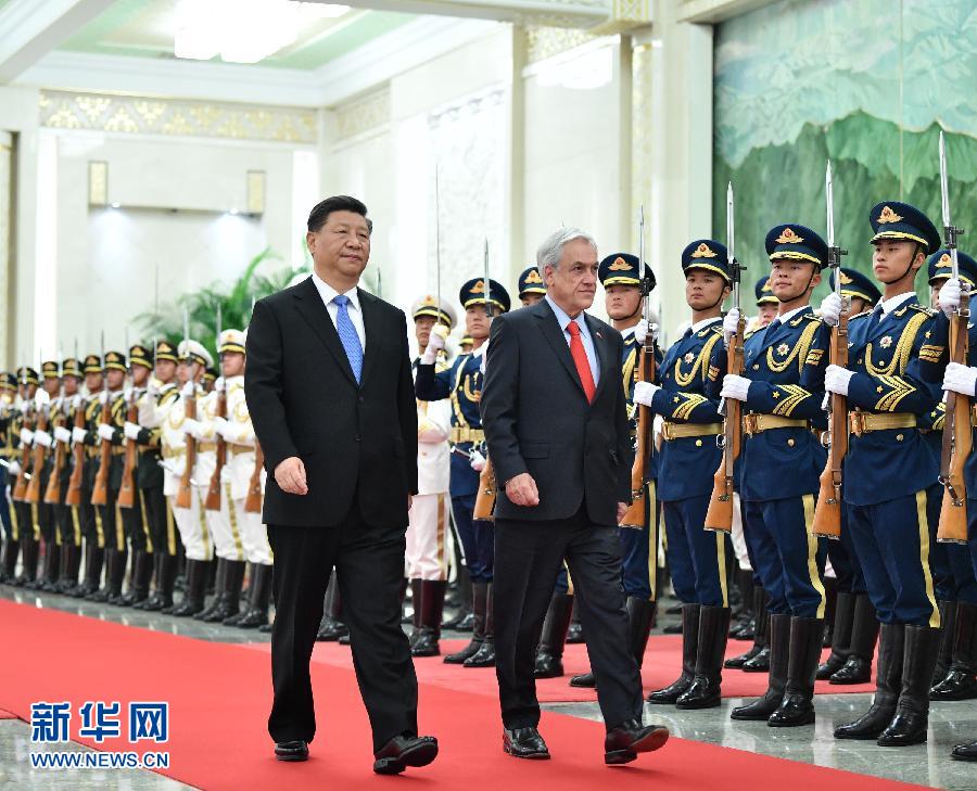 4月24日,國家主席習近平在北京人民大會堂同智利總統皮涅拉舉行會談。這是會談前,習近平在人民大會堂北大廳為皮涅拉舉行歡迎儀式。 新華社記者 饒愛民 攝