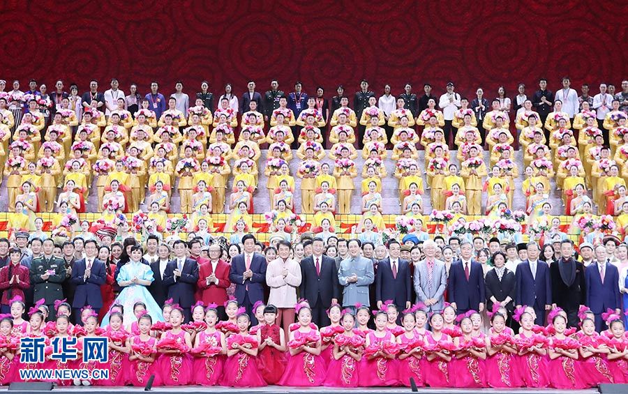 9月29日,慶祝中華人民共和國成立70周年大型文藝晚會《奮斗吧 中華兒女》在北京人民大會堂舉行。習近平、李克強、栗戰書、汪洋、王滬寧、趙樂際、韓正、王岐山等黨和國家領導人同4000多名觀眾一起觀看演出。演出結束后,習近平等走上舞臺同演職人員合影留念。 新華社記者 王曄 攝