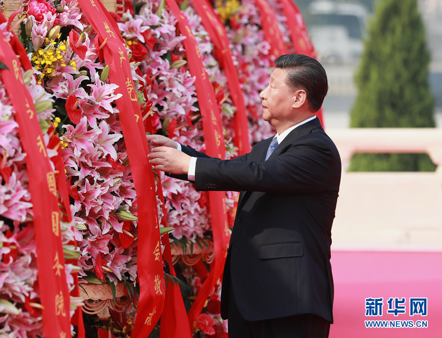 9月30日上午,習近平、李克強、栗戰書、汪洋、王滬寧、趙樂際、韓正、王岐山等黨和國家領導人來到北京天安門廣場,出席烈士紀念日向人民英雄敬獻花籃儀式。這是習近平整理花籃上的緞帶。 新華社記者 龐興雷 攝