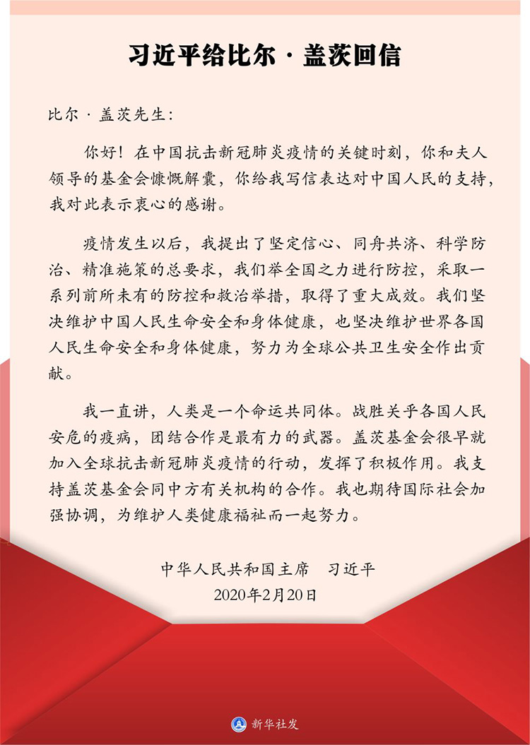 2月20日,在給美國蓋茨基金會(huì)聯(lián)席主席比爾·蓋茨的回信中,習(xí)近平主席這樣寫道。