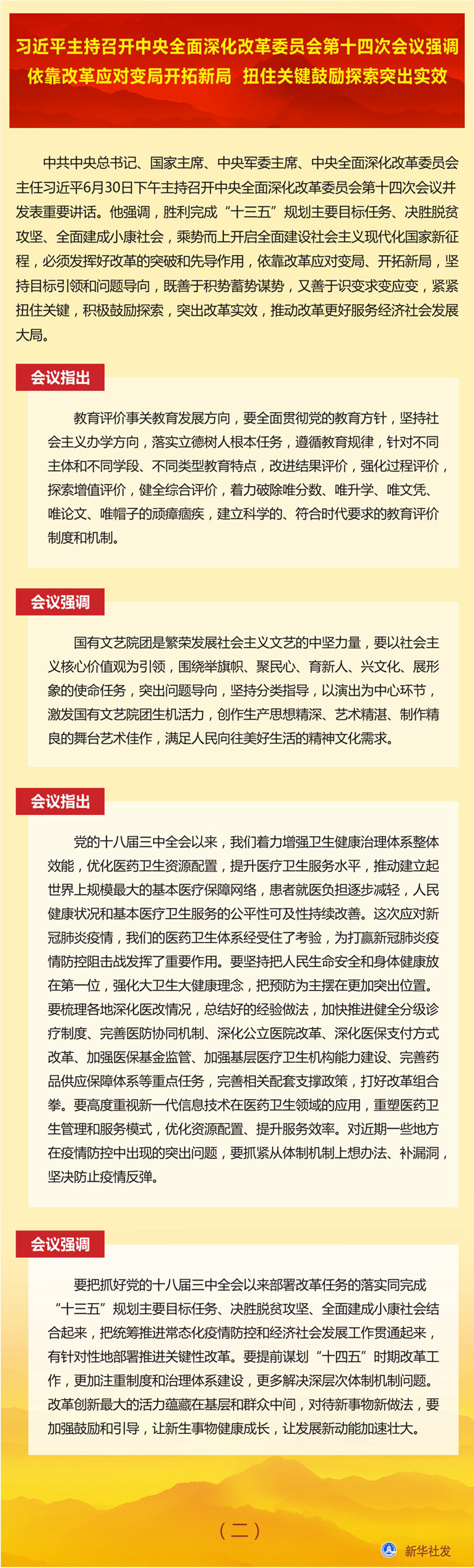 新華社北京6月30日電? 中共中央總書記、國家主席、中央軍委主席、中央全面深化改革委員會主任習近平6月30日下午主持召開中央全面深化改革委員會第十四次會議并發(fā)表重要講話。他強調(diào),勝利完成“十三五”規(guī)劃主要目標任務、決勝脫貧攻堅、全面建成小康社會,乘勢而上開啟全面建設社會主義現(xiàn)代化國家新征程,必須發(fā)揮好改革的突破和先導作用,依靠改革應對變局、開拓新局,堅持目標引領和問題導向,既善于積勢蓄勢謀勢,又善于識變求變應變,緊緊扭住關鍵,積極鼓勵探索,突出改革實效,推動改革更好服務經(jīng)濟社會發(fā)展大局。