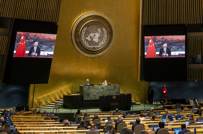 9月22日,國(guó)家主席習(xí)近平在第七十五屆聯(lián)合國(guó)大會(huì)一般性辯論上發(fā)表重要講話(huà)。新華社記者 鞠鵬 攝