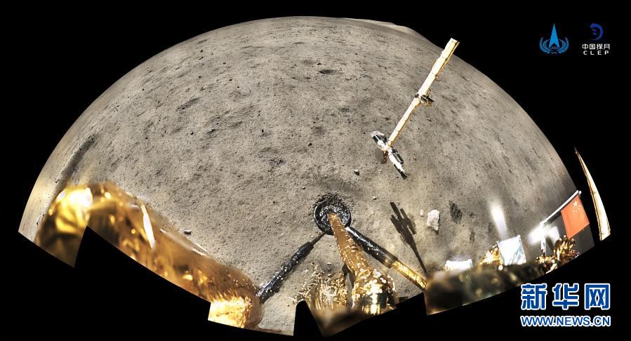 12月4日,國家航天局公布了探月工程嫦娥五號探測器在月球表面國旗展示的照片。嫦娥五號著陸器和上升器組合體全景相機環拍成像,五星紅旗在月面成功展開,此外圖像上方可見已完成表取采樣的機械臂及采樣器。新華社發(國家航天局供圖)