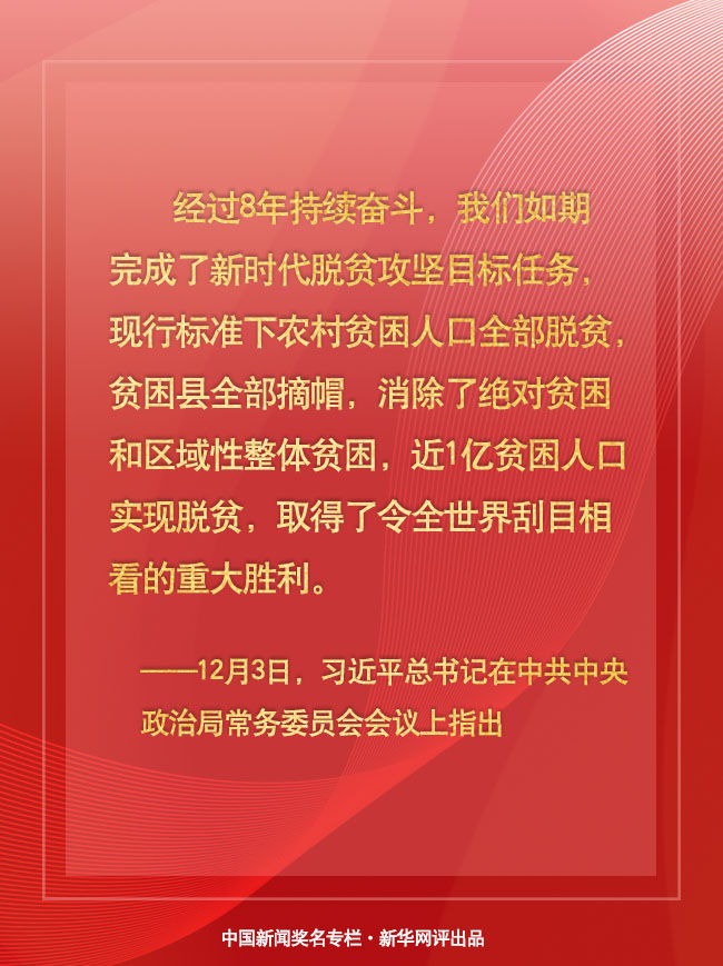 中共中央政治局常務委員會12月3日召開會議,聽取脫貧攻堅總結評估匯報。習近平總書記在會上指出,經過8年持續奮斗,我們如期完成了新時代脫貧攻堅目標任務,現行標準下農村貧困人口全部脫貧,貧困縣全部摘帽,消除了絕對貧困和區域性整體貧困,近1億貧困人口實現脫貧,取得了令全世界刮目相看的重大勝利。