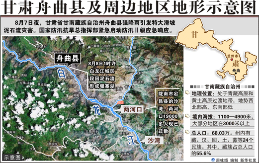 舟曲縣位于甘肅南部,甘南藏族自治州東南部,東鄰武都縣,北接宕昌縣,西南與迭部縣、文縣和四川省九寨溝縣接壤。全縣總面積3010平方公里,轄20個鄉(xiāng)、2個鎮(zhèn),210個行政村,總人口13.47萬人,其中藏族4.4萬人,占32.78%。 舟曲縣地處南秦嶺山區(qū),東南至西北走向的岷山山系貫穿全境。氣候屬溫暖帶區(qū),海拔高度在1173-4504米之間。地勢西北高,東南低,地形復雜,溝壑縱橫,高低懸殊,是典型的高山峽谷區(qū),氣候垂直變化明顯,常有“山下桃花盛開,山上白雪皚皚”的自然景觀,同時也表現(xiàn)出“十里不同天,一山有四景”的氣候特點。春季溫暖回升快而穩(wěn),秋季溫涼陰雨多。年均降水量400-800毫米,年日照時數(shù)1842小時,冬無嚴寒,夏無酷暑,素有”隴上桃花源”之稱。 |