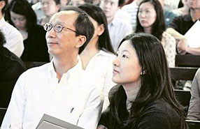伏明霞梁錦松早早到校排隊給兒子報名