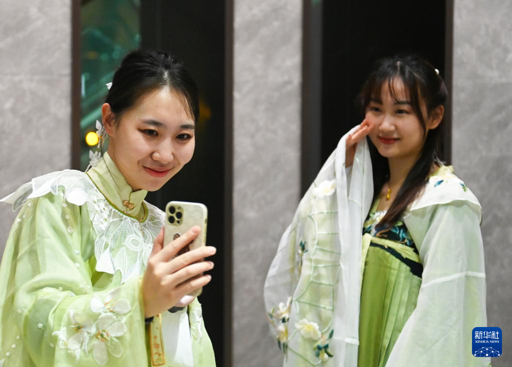 2月4日,汉服爱好者在中国文字博物馆里拍照留念。