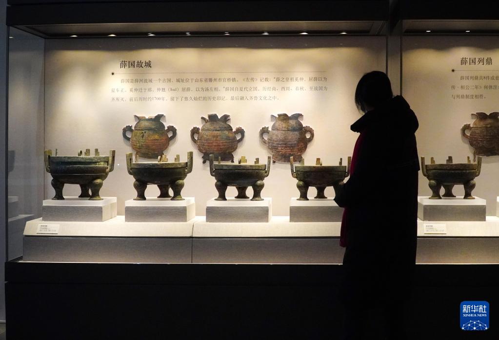 2月9日,在孔子博物馆举行的山东文物精品展上,参观者在观看济宁市博物馆收藏的春秋薛国列鼎。