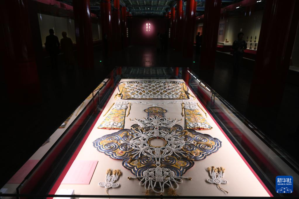 这是4月28日在北京故宫博物院拍摄的黄色缎绣缀砗磲璎珞衣。