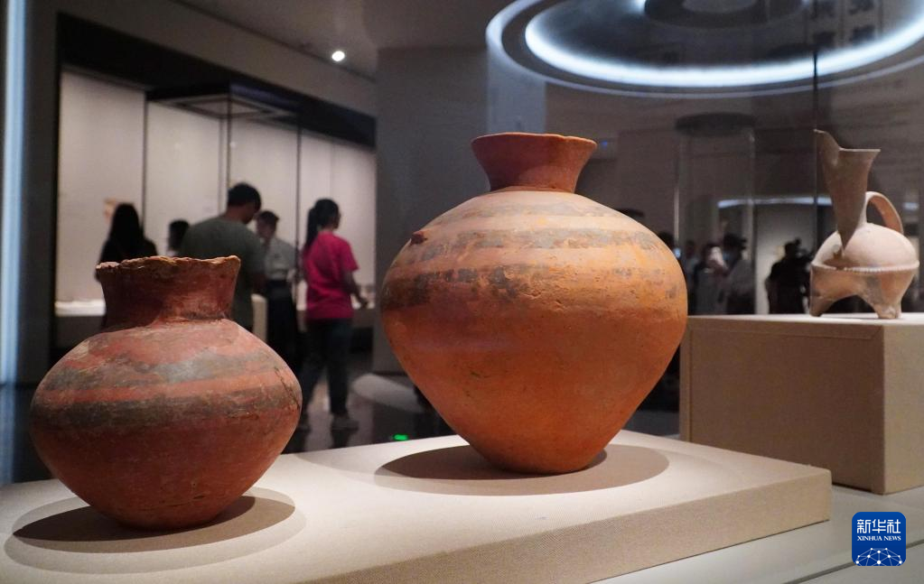 5月15日,在山东省青州博物馆新馆,大汶口文化彩陶壶正在进行展出。