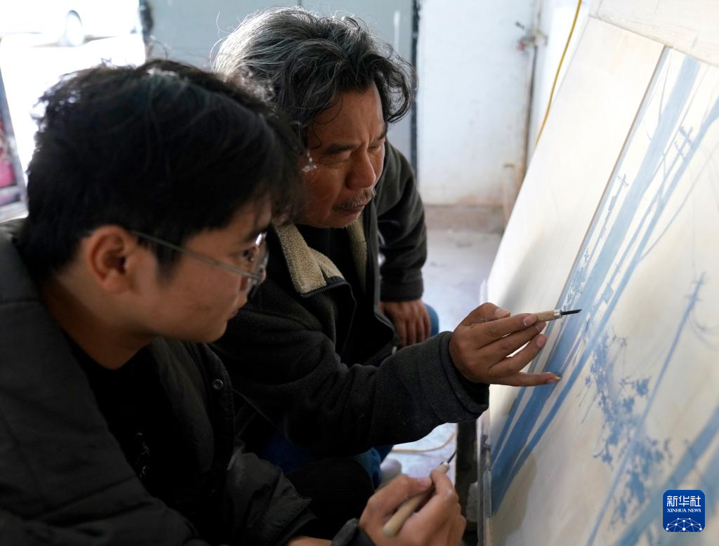 12月14日,罗小聪(右)在工作室内给一名学生讲解绘画构图知识。