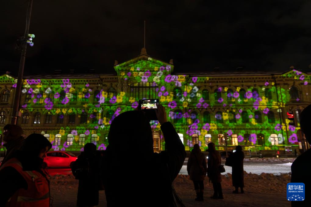 这是1月3日在芬兰赫尔辛基拍摄的一座灯光装置。