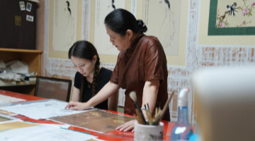 9月25日,在“观绣园”传习所内,卢建英(右)在向女儿潘乃舒讲解勾线方法。