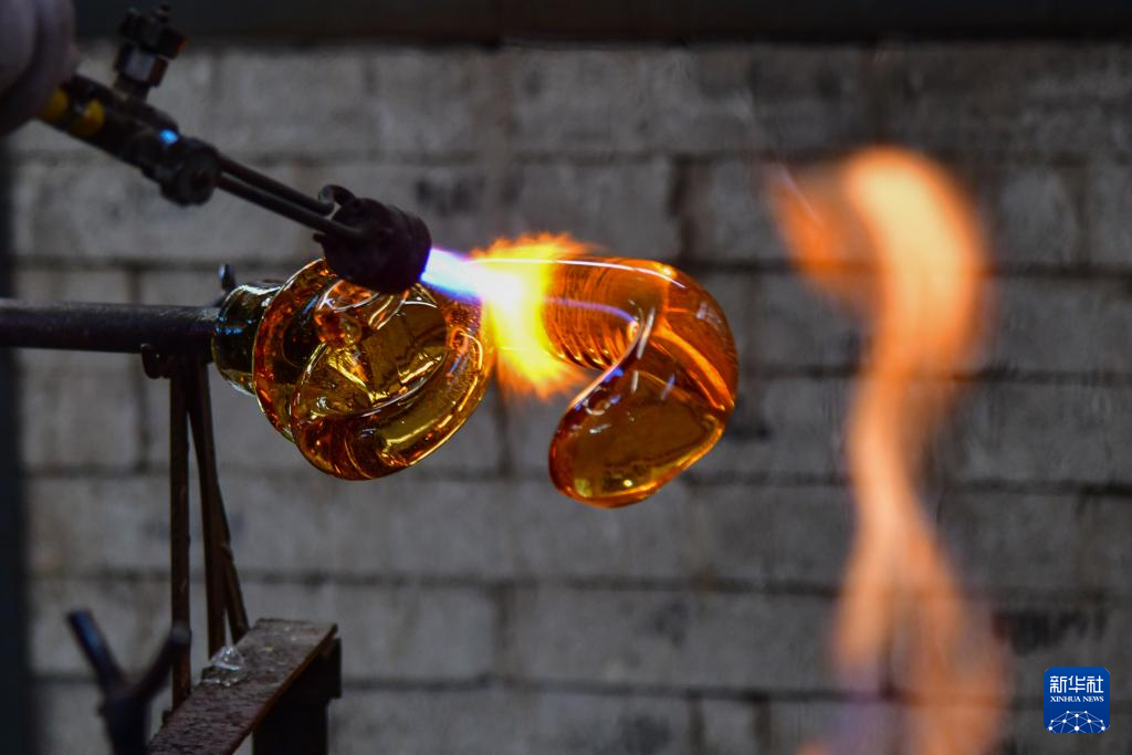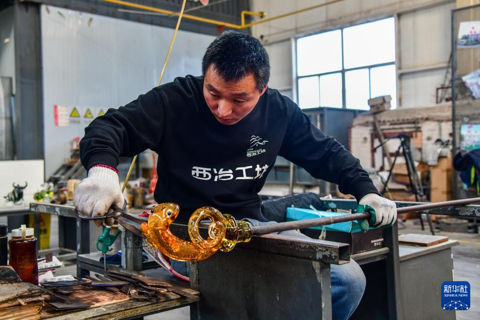 1月9日,在淄博市博山区的西冶工坊,工匠在加工琉璃工艺品。