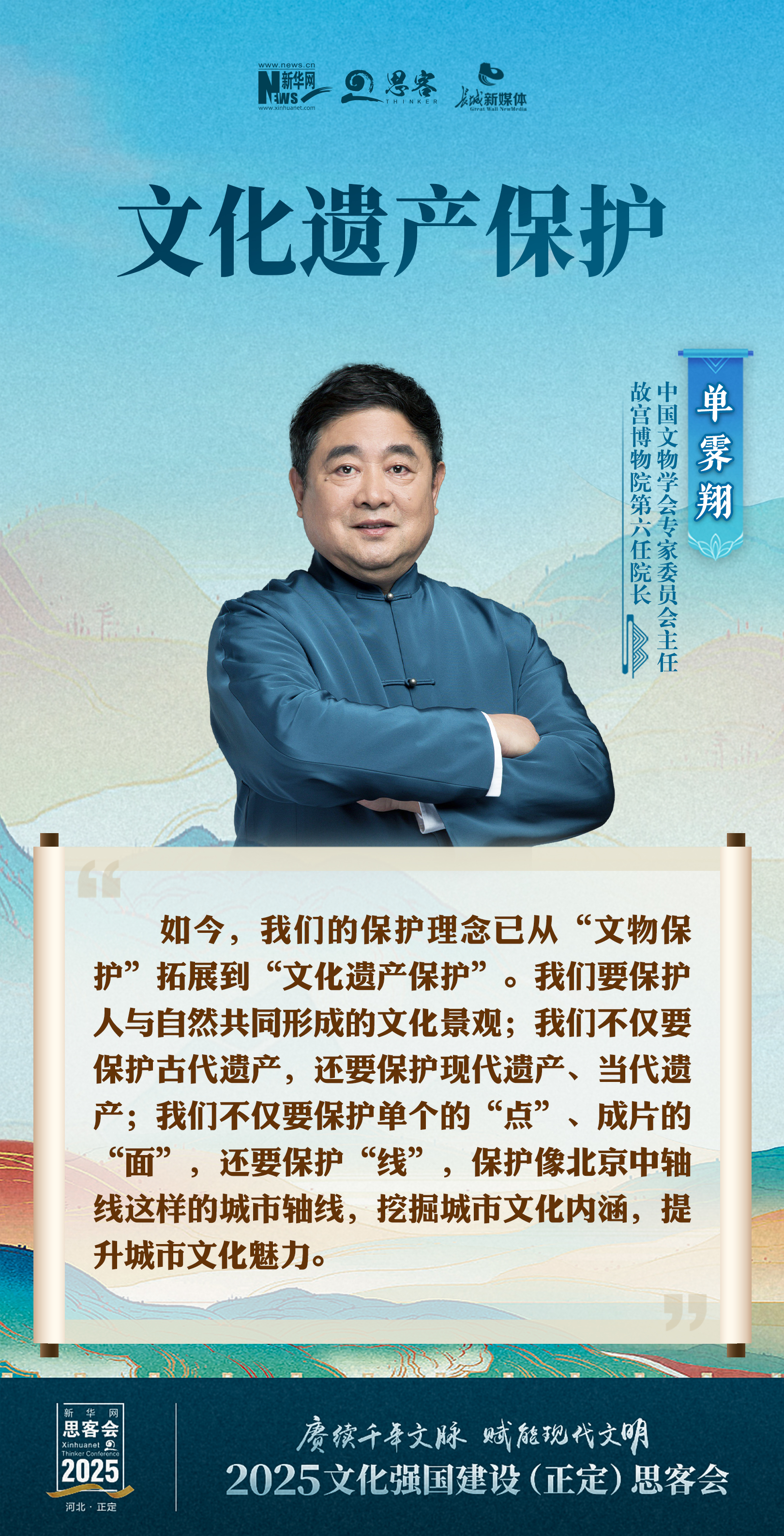 如今,我们的保护理念已从“文物保护”拓展到“文化遗产保护”。我们要保护人与自然共同形成的文化景观;我们不仅要保护古代遗产,还要保护现代遗产、当代遗产;我们不仅要保护单个的“点”、成片的“面”,还要保护“线”,保护像北京中轴线这样的城市轴线,挖掘城市文化内涵,提升城市文化魅力。