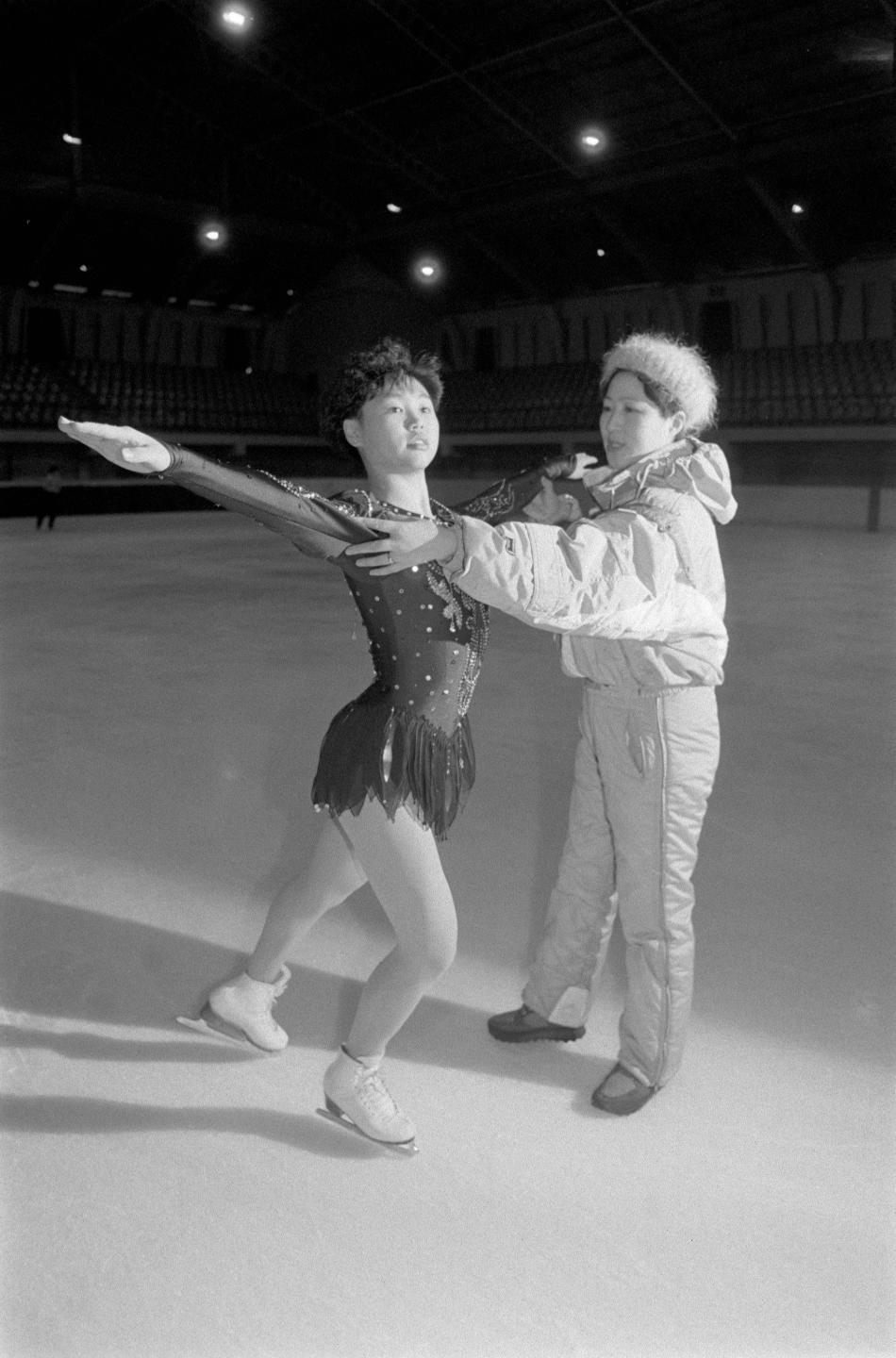 ↑为备战在挪威利勒哈默尔举行的第17届冬季奥运会,17岁的陈露在教练李明珠指导下认真训练(1994年1月4日发)。