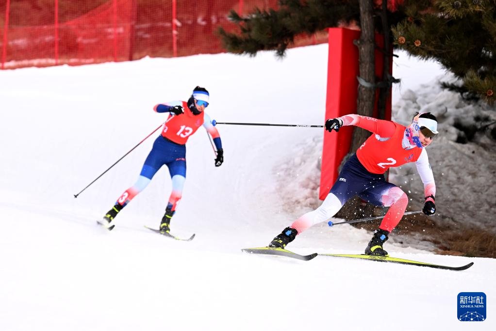 2月14日,黑龙江选手池春雪(右)在比赛中,她以41分26秒0的成绩夺得冠军。