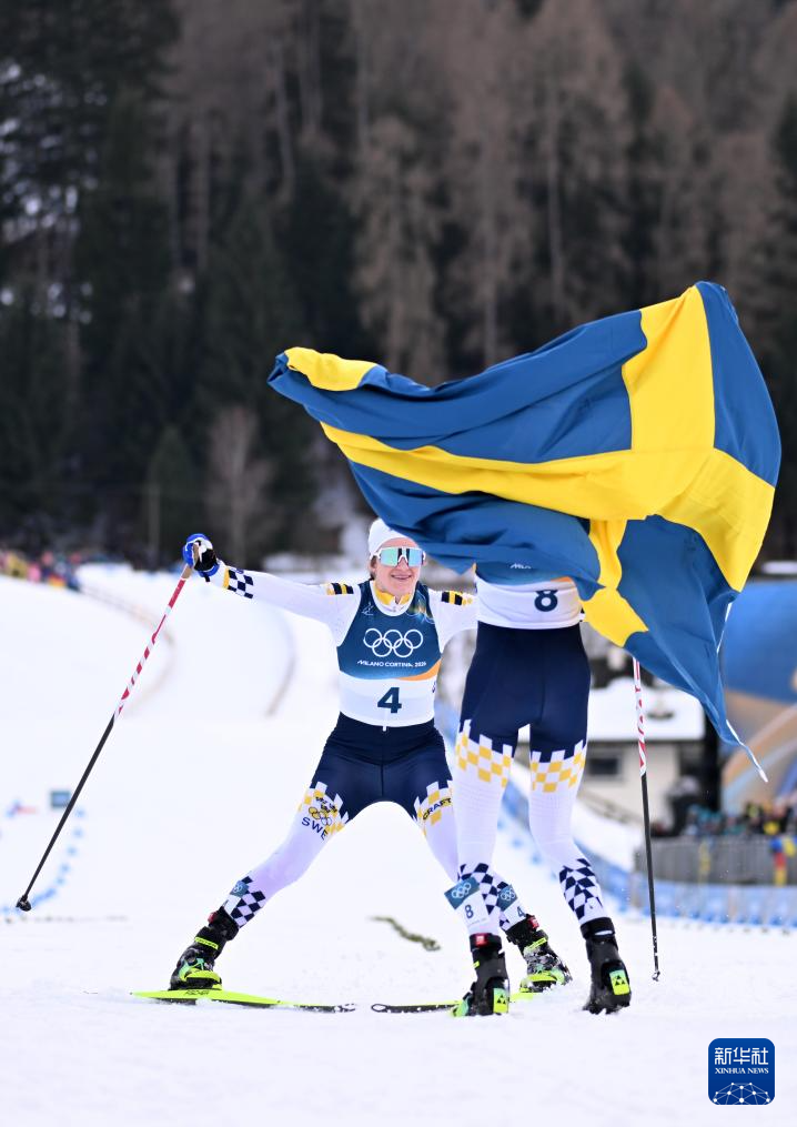 2月7日,亚军瑞典选手埃芭·安德松(左)冲线后与冠军瑞典选手弗里达·卡尔松庆祝。