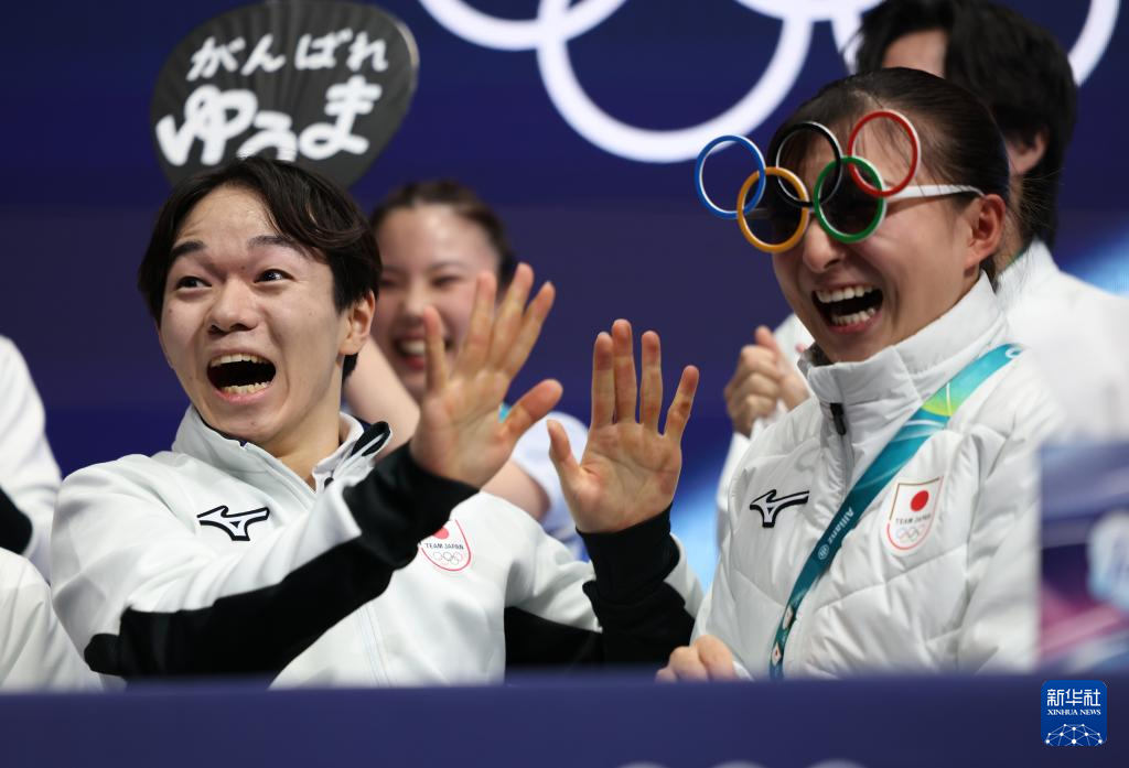 2月7日,日本队选手键山优真得知成绩后庆祝。