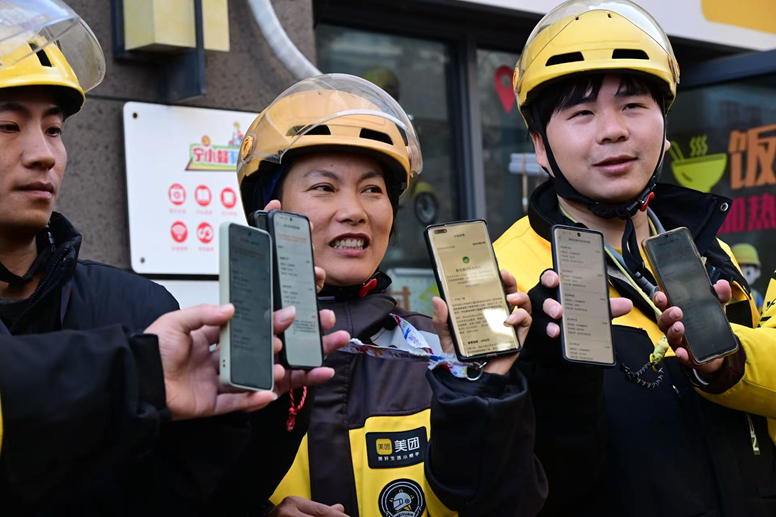 12月10日,江苏南京,骑手们展示收到社保补贴的手机页面信息